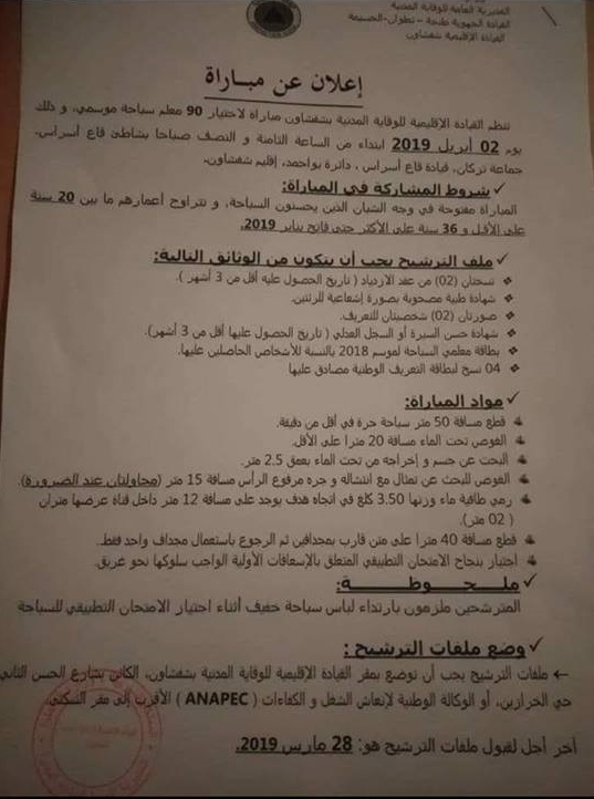 Alwadifa ANAPEC / Alwadifa Maroc / Autres offres d'emploi / Emploi diplomés / Offres d'emploi ANAPEC / Par fonction / Type إعلان عن مباراة منقذي السباحة الموسميين 2019 بشفشاون ShareSharePin It إعلان عن مباراة منقذي السباحة الموسميين 2019 بشفشاون إعلان عن مباراة منقذي السباحة الموسميين 2019 بالعيون