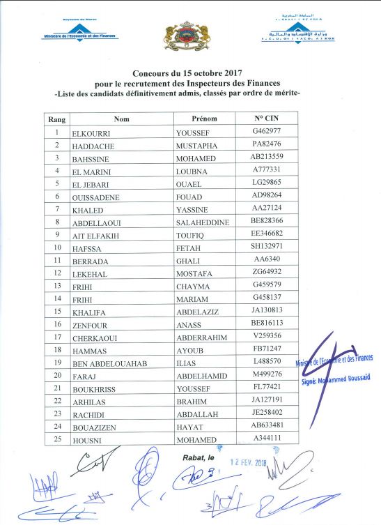 Alwadifa Maroc / Ministère de l'économie et des finances / Par ministere / Resultats du concours وزارة الإقتصاد والمالية لائحة الناجحين في مباراة لتوظيف 25 مفتش المالية دورة 15 اكتوبر 2017 ShareSharePin It وزارة الإقتصاد والمالية لائحة الناجحين في مباراة لتوظيف 25 مفتش المالية دورة 15 اكتوبر 2017 لائحة الناجحين إضغط هنا