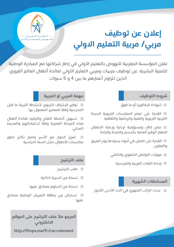 Alwadifa Maroc / Autres offres d'emploi / Emploi news استمارة الترشيح الالكتروني لمباراة توظيف مربين ومربيات بالمؤسسة المغربية للنهوض بالتعليم الأولي 2019 ShareSharePin It استمارة الترشيح الالكتروني لمباراة توظيف مربين ومربيات بالمؤسسة المغربية للنهوض بالتعليم الأولي 2019 رابط تقديم الترشيحات