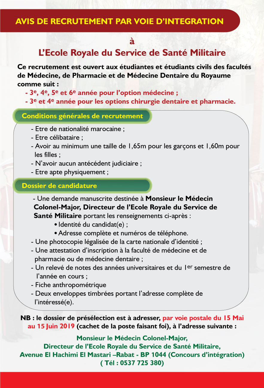 Alwadifa Maroc / Autres offres d'emploi / Emploi news تجنيد طلبة الطب والصيدلة وطب الأسنان عبر الإدماج بالمدرسة الملكية لمصلحة الصحة العسكرية 2019 ShareSharePin It تجنيد طلبة الطب والصيدلة وطب الأسنان عبر الإدماج بالمدرسة الملكية لمصلحة الصحة العسكرية 2019