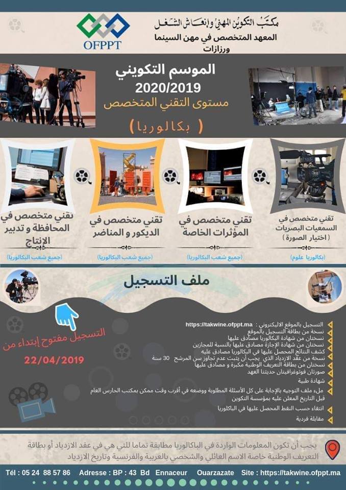 Alwadifa Maroc / Alwadifa Ouarzazate / Etablissement Public / Par ville / Type التسجيل في المعهد المتخصص في السينما بورزازت للموسم 2019/2020 التسجيل ابتداء من 22 أبريل 2019 ShareSharePin It التسجيل في المعهد المتخصص في السينما بورزازت للموسم 2019/2020 التسجيل ابتداء من 22 أبريل 2019 Emploi Ouarzazate رابط التسجيل