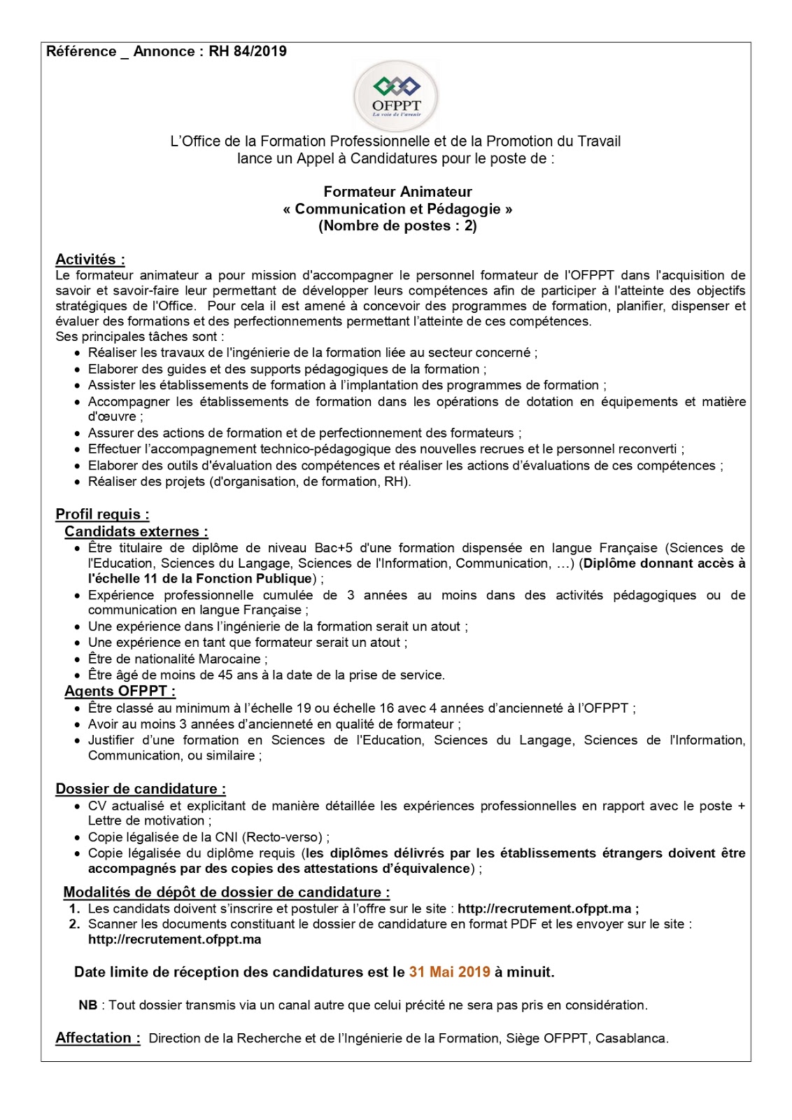 Alwadifa Maroc / Alwadifa tout le Maroc / Emploi public / Offre d'emploi maroc / Offres d'emploi Bac + 5 / Offres d'emploi OFPPT / Par fonction / Par ville / Type مكتب التكوين المهني وإنعاش الشغل مباراة لتوظيف 02 مكونين منشطين في التواصل و البيداغوجيا آخر أجل 31 ماي 2019 ShareSharePin It مكتب التكوين المهني وإنعاش الشغل مباراة لتوظيف 02 مكونين منشطين في التواصل و البيداغوجيا آخر أجل 31 ماي 2019 نص الاعلان