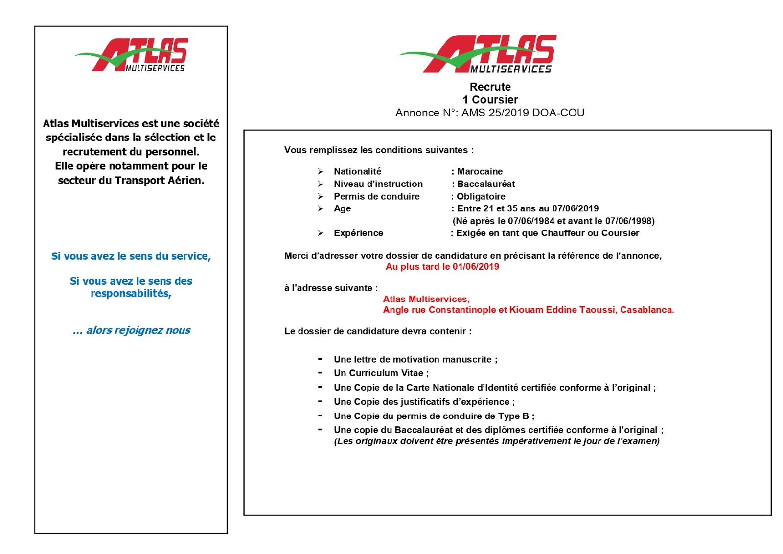 Alwadifa chauffeurs / Alwadifa Maroc / Alwadifa tout le Maroc / Atlas Multiservices / Autres offres d'emploi / Emploi public / Offre d'emploi maroc / Par ville / Type أطلس مولتي سيرفيس مباراة لتوظيف 01 سائق آخر أجل 1 يونيو 2019 ShareSharePin It أطلس مولتي سيرفيس مباراة لتوظيف 01 سائق آخر أجل 1 يونيو 2019 نص الاعلان