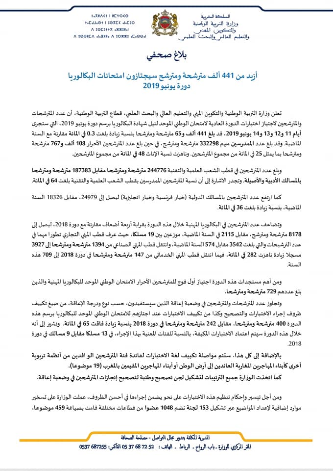 Alwadifa Maroc / Alwadifa tout le Maroc / Autres offres d'emploi / Bac 2023 / Emploi public / Ministère de l'éducation / Offre d'emploi maroc / Par ministere / Par ville وزارة التربية الوطنية أزيد من 441 ألف مترشحة ومترشح سيجتازون امتحانات الباكالوريا 2019 ShareSharePin It وزارة التربية الوطنية أزيد من 441 ألف مترشحة ومترشح سيجتازون امتحانات الباكالوريا 2019