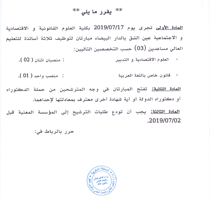 Alwadifa Casablanca / Alwadifa doctorat / Alwadifa Maroc / Autres offres d'emploi / Emploi public / Etablissement Public / Offre d'emploi maroc / Offre d'emploi maroc / Offre d’emploi Casablanca / Offres d'emploi doctorat / Par fonction / Par ville / Type كلية الحقوق عين الشق مباراة لتوظيف ثلاثة أساتذة للتعليم العالي مساعدين آخر أجل 1 يوليوز 2019 ShareSharePin It كلية الحقوق عين الشق مباراة لتوظيف ثلاثة أساتذة للتعليم العالي مساعدين آخر أجل 1 يوليوز 2019 نص الاعلان