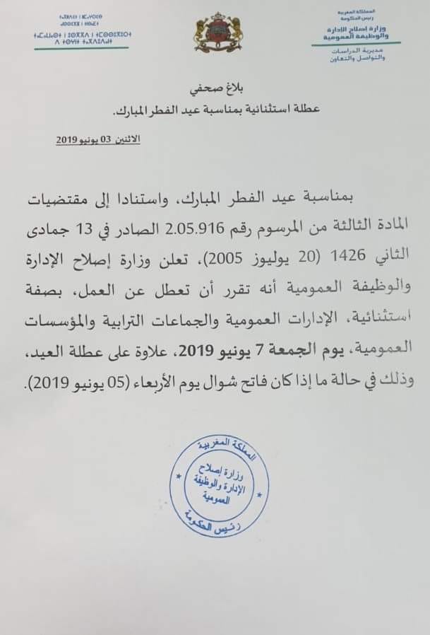Alwadifa Maroc / Autres offres d'emploi / Emploi news / Emploi public / Offre d'emploi maroc عطلة استثنائية في الإدارات والجماعات والمؤسسات العمومية علاوة على عطلة العيد ShareSharePin It عطلة استثنائية في الإدارات والجماعات والمؤسسات العمومية علاوة على عطلة العيد