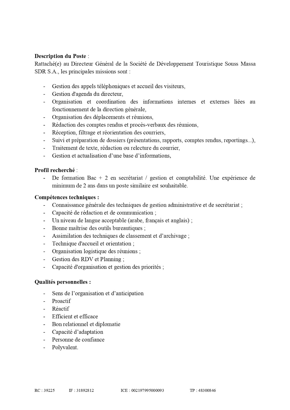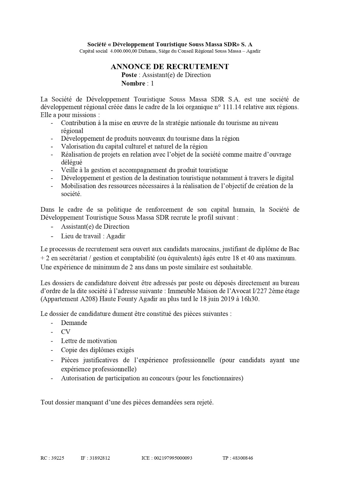 Alwadifa Agadir / Alwadifa Maroc / Emploi diplomés / Emploi public / Etablissement Public / Offre d'emploi Agadir / Offre d'emploi maroc / Offre d'emploi maroc / Offres d'emploi Bac + 2 / Par fonction / Par ville / Type شركة التنمية السياحية سوس ماسة مباراة لتوظيف 01 مساعد(ة) إدارة آخر أجل 18 يونيو 2019 ShareSharePin It شركة التنمية السياحية سوس ماسة مباراة لتوظيف 01 مساعد(ة) إدارة آخر أجل 18 يونيو 2019 نص الاعلان