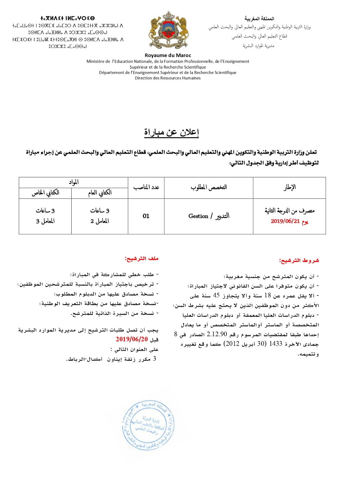 Alwadifa Maroc / Alwadifa master / Alwadifa tout le Maroc / Autres offres d'emploi / Emploi public / Ministère de l'éducation / Offre d'emploi maroc / Offres d'emploi master / Par fonction / Par ministere / Par ville قطاع التعليم العالي والبحث العلمي مباراة لتوظيف 01 متصرف من الدرجة الثانية آخر أجل 20 يونيو 2019 ShareSharePin It قطاع التعليم العالي والبحث العلمي مباراة لتوظيف 01 متصرف من الدرجة الثانية آخر أجل 20 يونيو 2019 نص الاعلان