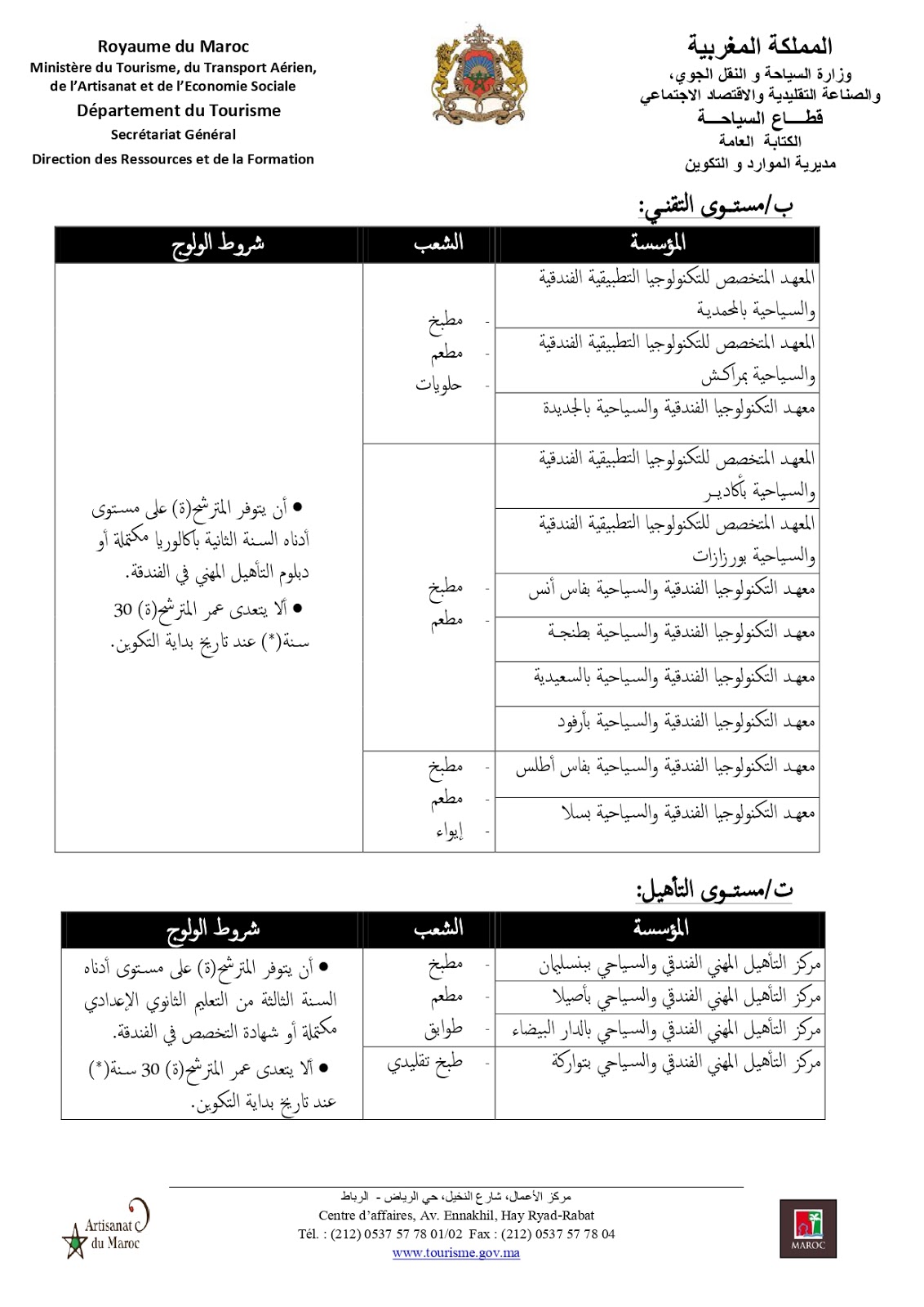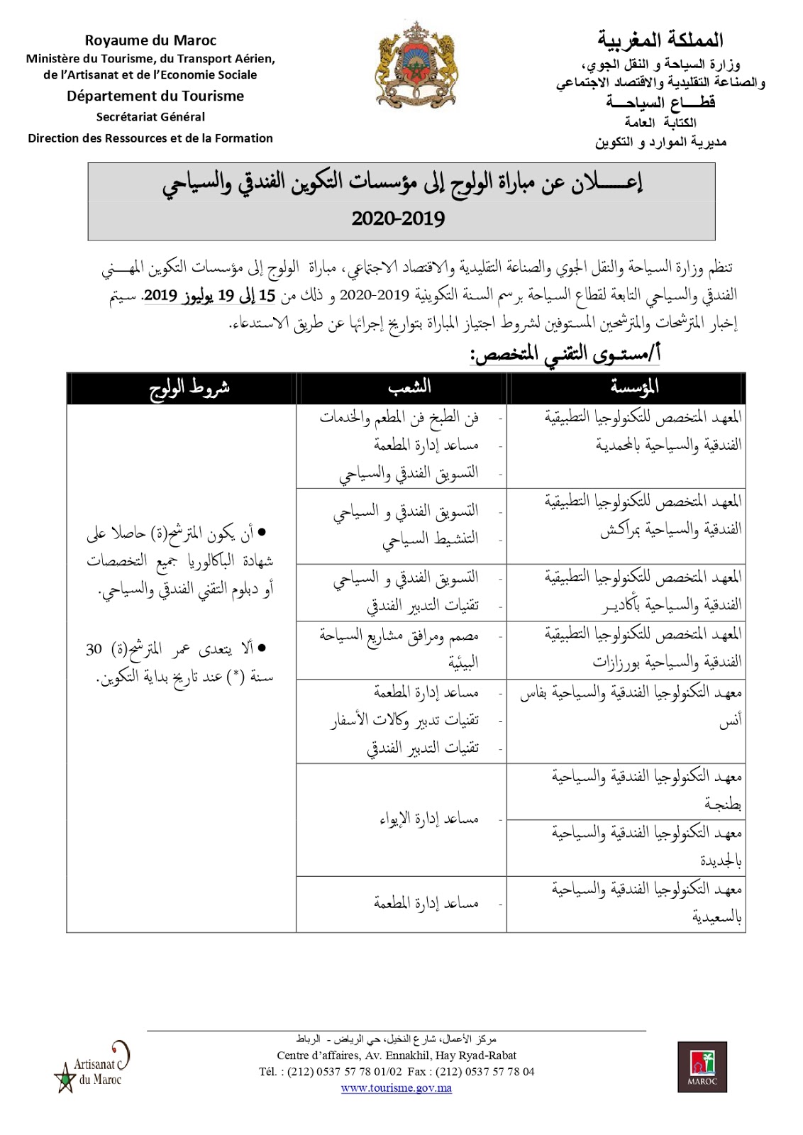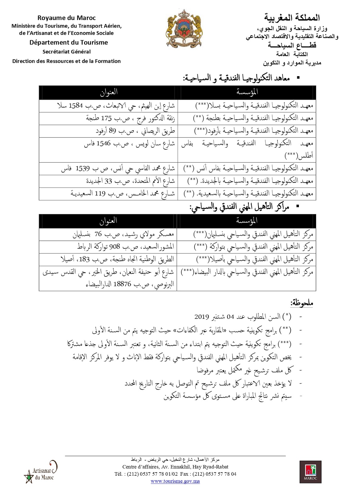Alwadifa Maroc / Alwadifa tout le Maroc / Emploi public / Etablissement Public / Offre d'emploi maroc / Par ville / Type إعلان عن مباراة الولوج إلى مؤسسات التكوين الفندقي والسياحي 2020/2019 ShareSharePin It إعلان عن مباراة الولوج إلى مؤسسات التكوين الفندقي والسياحي 2020/2019 رابط التسجيل
