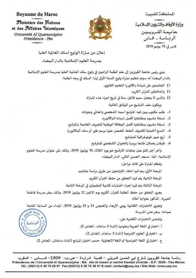 Alwadifa Casablanca / Alwadifa Maroc / Emploi public / Etablissement Public / Offre d'emploi maroc / Offre d'emploi maroc / Offre d’emploi Casablanca / Par ville / Type إعلان عن مباراة الولوج لسلك العالمية العليا بمدرسة العلوم الإسلامية بالدار البيضاء 2020/2019 ShareSharePin It إعلان عن مباراة الولوج لسلك العالمية العليا بمدرسة العلوم الإسلامية بالدار البيضاء 2020/2019