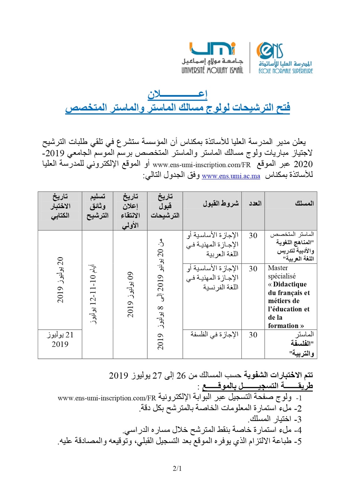 Alwadifa Maroc / Alwadifa Meknes / Emploi public / Master ENS Meknés / Master Maroc / Offre d'emploi maroc / Par ville المدرسة العليا للأساتذة بمكناس مباراة ولوج سلك الماستر 2019-2020 ShareSharePin It المدرسة العليا للأساتذة بمكناس مباراة ولوج سلك الماستر 2019-2020 Préinscription