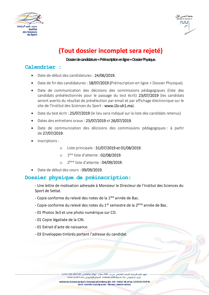 Alwadifa Maroc / Alwadifa Settat / Autres offres d'emploi / Emploi public / Etablissement Public / Licence professionnelle / Par fonction / Par ville / Type معهد علوم الرياضة بسطات مباراة ولوج السنة الاولى من الاجازة المهنية في التدبير الرياضي آخر آجل 18 يوليوز 2019 ShareSharePin It معهد علوم الرياضة بسطات مباراة ولوج السنة الاولى من الاجازة المهنية في التدبير الرياضي آخر آجل 18 يوليوز 2019 للتسجيل اضغط هنا