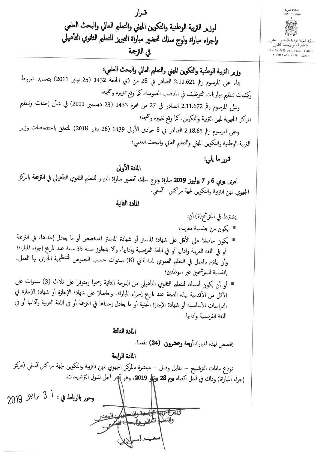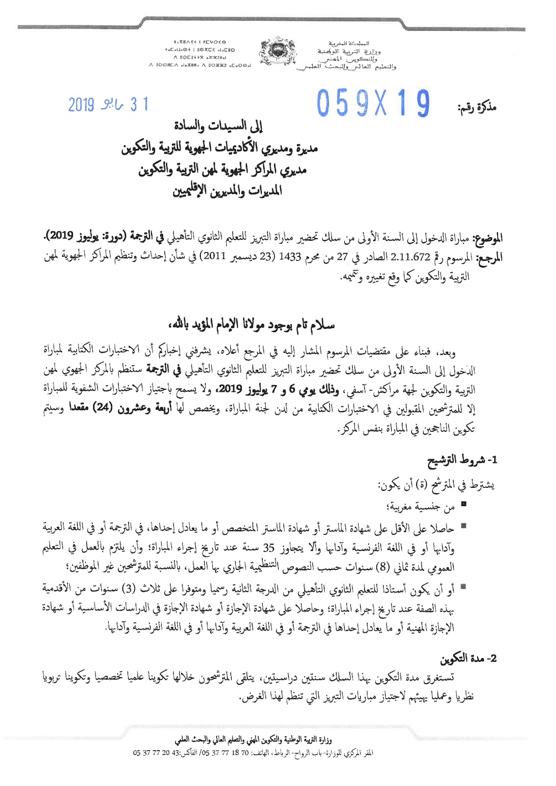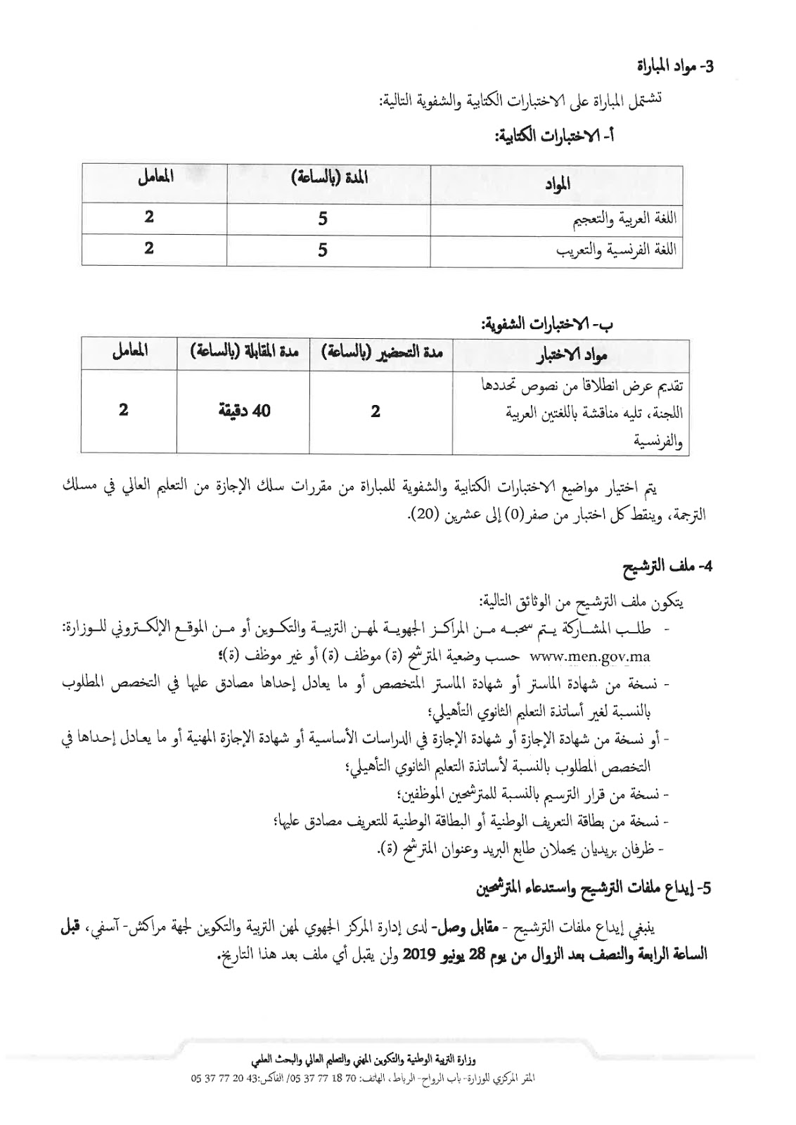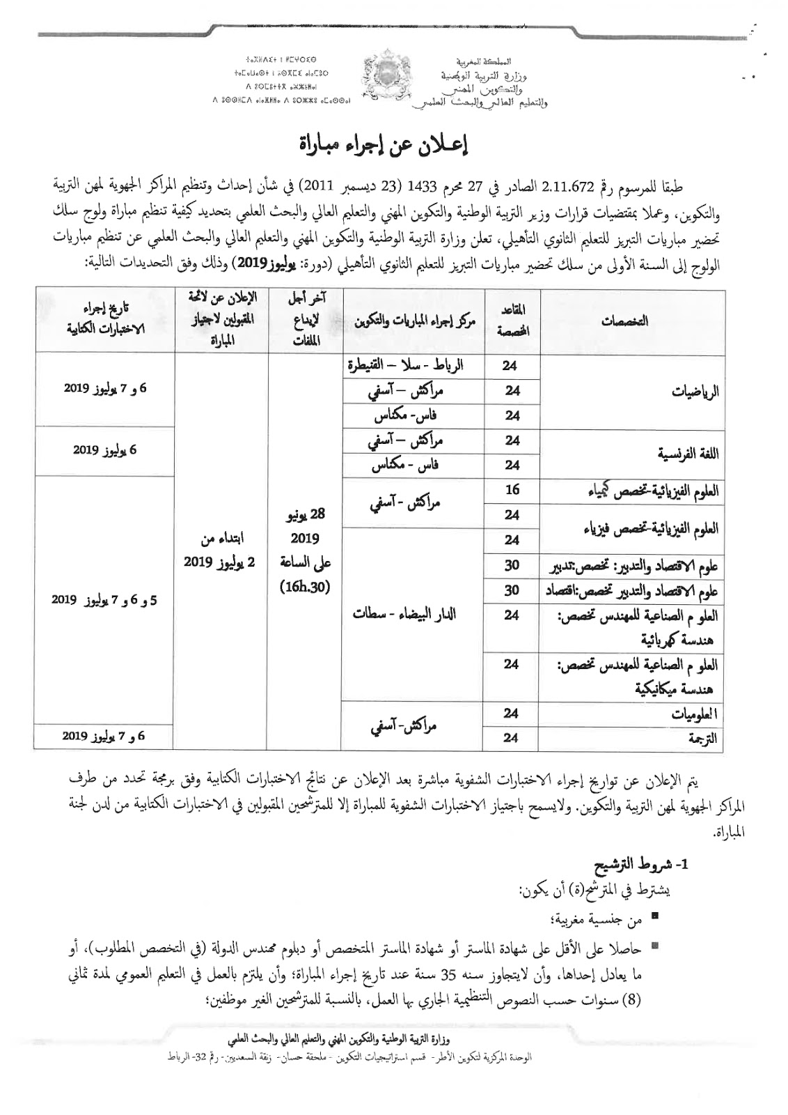 Alwadifa Maroc / Alwadifa master / Alwadifa tout le Maroc / Autres offres d'emploi / Emploi public / Ministère de l'éducation / Offre d'emploi maroc / Offres d'emploi master / Par fonction / Par ministere / Par ville وزارة التربية الوطنية: مباراة لتوظيف 340 أستاذ(ة) مبرز. آخر أجل للترشيح 28 يونيو 2019 ShareSharePin It وزارة التربية الوطنية: مباراة لتوظيف 340 أستاذ(ة) مبرز. آخر أجل للترشيح 28 يونيو 2019 نص الاعلان