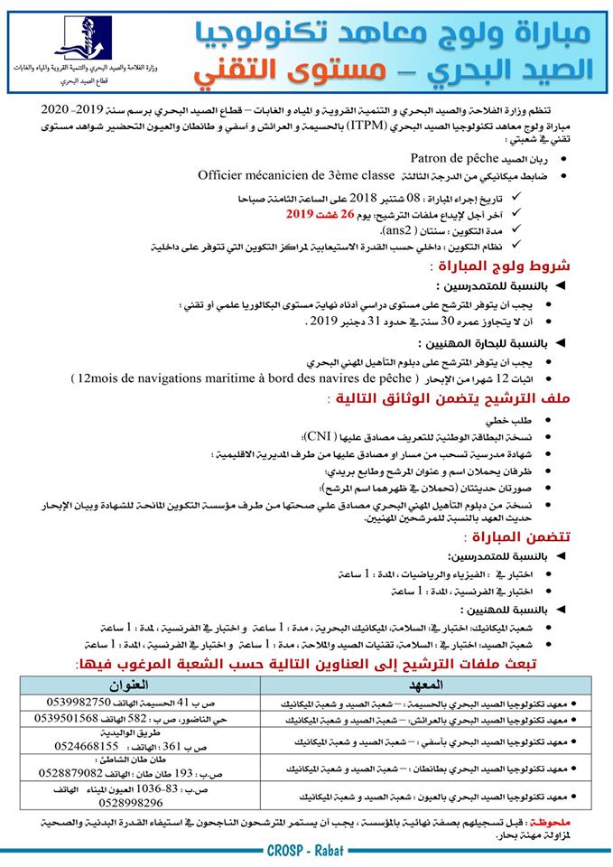 Alwadifa Maroc / Emploi public / Etablissement Public / Offre d'emploi maroc / Type مباراة ولوج معاهد تكنولوجيا الصيد البحري مستوى التقني 2019-2020 ShareSharePin It مباراة ولوج معاهد تكنولوجيا الصيد البحري مستوى التقني 2019-2020
