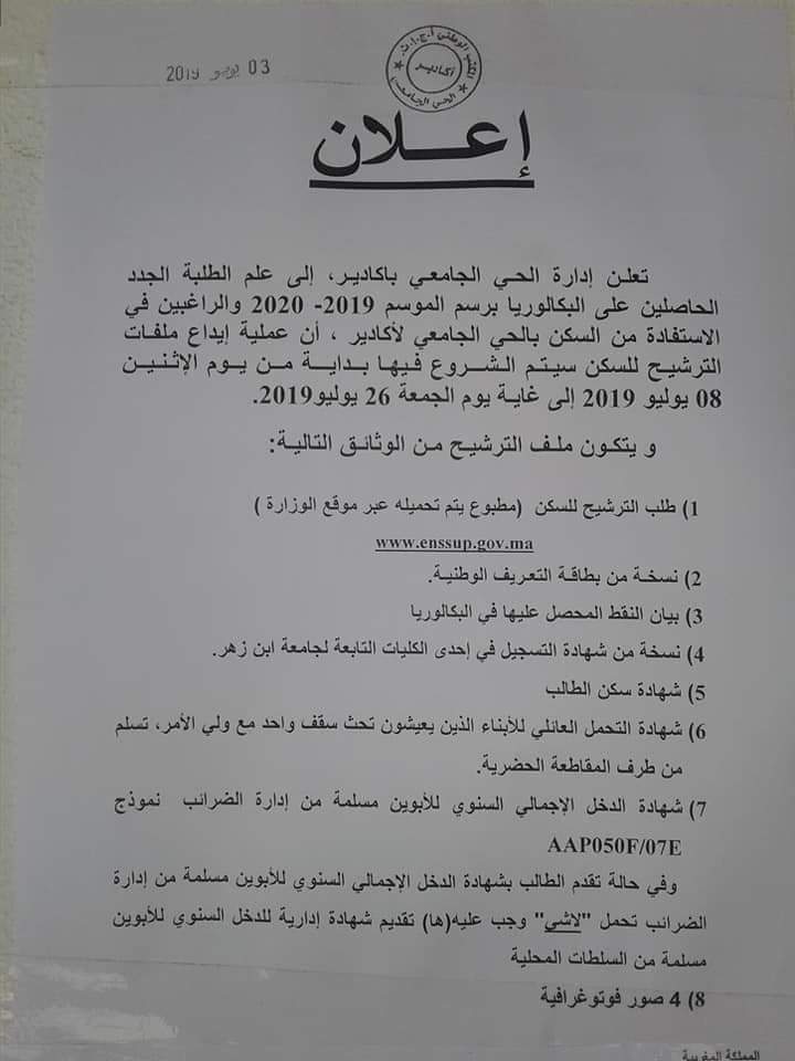 Alwadifa Maroc / Autres offres d'emploi / Emploi news / Emploi public / Offre d'emploi maroc التسجيل بالحي الجامعي برسم السنة الجامعية 2019-2020 ShareSharePin It التسجيل بالحي الجامعي برسم السنة الجامعية 2019-2020